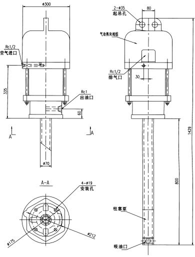 三、使用要領 1、以托架(用戶自備)作支承,用四只M16的螺栓把氣動泵固定在托架上,柱塞泵管垂直插入貯油箱的油脂中。 2、進氣管路上必須配接氣源處理處理三大件(過濾、減壓、油霧器),目的是使氣動泵能獲得潔將、穩(wěn)壓、帶油霧狀的壓縮空氣。 3、所使用的介質必須在規(guī)定范圍內。 4、氣動泵出油口處必須配接單向閥。 5、建議供氣量調定在泵工作頻率不超過20次/min為宜。 6、使用2#油脂時建議油箱內加設壓油盤,以免因潤滑脂流動性差而使泵產生吸空。 7、排氣口配接消聲器(用戶自備,接口Rc1/2)。