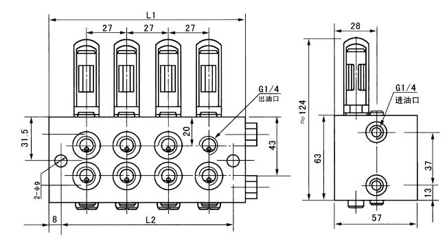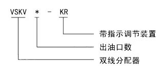 VSKV-KR型雙線分配器正面設(shè)上下二排出油口,分配器活塞正反向動(dòng)作時(shí)分別從上排和下排的出油口排出潤滑脂。還可以從指示桿的動(dòng)作直接觀察分配器的工作情況,并可通過調(diào)整螺釘在規(guī)定范圍內(nèi)調(diào)整出油口的給油量。