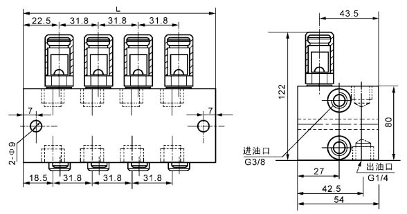 若需相應(yīng)上下出口合并時(shí),只要將孔內(nèi)的螺釘擰出,把上或下不用的那個(gè)出油口用G1/4螺塞封堵以防灰塵侵入。