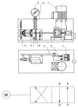 電動(dòng)機(jī)經(jīng)蝸輪蝸桿減速后,由偏心輪2帶動(dòng)連桿3 作直線往復(fù)運(yùn)動(dòng)。由于連桿末端所連動(dòng)的彈簧機(jī)構(gòu)4的作用,使二位四通閥5中的滑芯桿6產(chǎn)生急速的推拉動(dòng)作,從而改變二位四通閥各油口的聯(lián)接方式,達(dá)到液流換向的目的。此時(shí),偏心輪旋轉(zhuǎn)了180°到達(dá)另一個(gè)死點(diǎn)位置,觸動(dòng)了限位開(kāi)關(guān)7。限位開(kāi)關(guān)即可送出脈沖信號(hào),停止閥電機(jī)運(yùn)行,完成了一個(gè)工作過(guò)程。壓力表8裝于防護(hù)罩9頂部用于監(jiān)視閥內(nèi)的工作壓力。