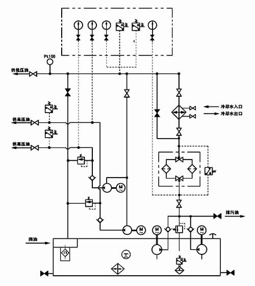稀油站二根高壓輸出管道的壓力均為31.5MPa,流量各為2.5L/min,低壓部分的壓力為0.4MPa,低壓流量為16~100L/min;稀油站具有過濾、冷卻、加熱等裝置和聯(lián)鎖、報(bào)警、自控等功能。