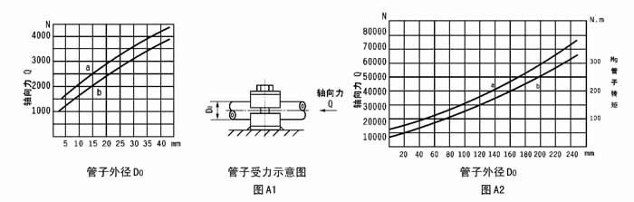 A2 具體內(nèi)容:圖A1 用于“A 系列管夾”;圖A2 用于“B 系列Ⅰ型管夾”。a 曲線表示管夾與管子處于“靜摩擦狀態(tài)”時,管子外徑尺寸與管夾承受管子軸向力的函數(shù)關(guān)系。b曲線表示管夾與管子處于“動摩擦狀態(tài)”時,管子外徑尺寸與管夾承受管子軸向力及轉(zhuǎn)矩的函數(shù)關(guān)系。 |