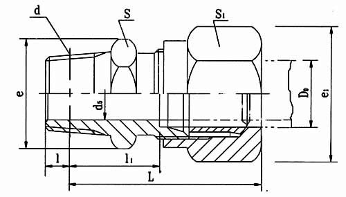 公稱壓力E級,管子外徑D0為14mm的卡套式錐螺紋直通管接頭: