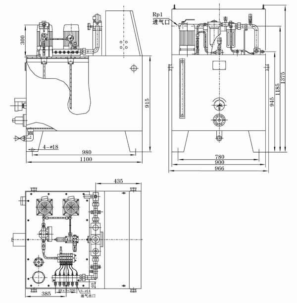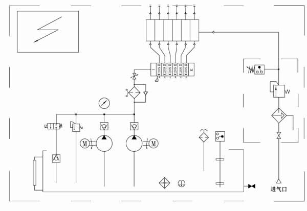 該站主要由油箱(帶電加熱器、液位計(jì)、電接點(diǎn)溫度計(jì)、空氣濾清器、液位控制器)、兩臺高壓油泵裝置(一備一用)、溢流閥、二位二通電磁閥、過濾器、單向閥、壓力表、KM型遞進(jìn)式分配器、油氣混合器、壓力控制器及氣動(dòng)三聯(lián)件和PLC電氣控制箱等組成。